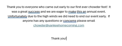 As the President of Yankee Homecoming Board of Directors, I want to thank everyone that supported this brand-new fundraiser. The Chowder Fest is something we have talked about for years but had not yet committed to. Once we found out the waterfront was going to be open on Oct 12th during the long weekend and our promise to raise funds early for next year’s festival this was the perfect time to make this happen. I can’t begin to tell you how much work went into pulling this together in such a short amount of time. From the City Council, Licensing and Permitting, City Clerk, Board of Health, Police and DPW who quickly added us to their agenda and ensured we had all requirements approved. To the restaurants who quickly got on board with the idea and not only donated their product but also their time during a busy holiday weekend. The amazing crafters and musicians that quickly jumped at the chance to be part of our show on the waterfront and specifically those that braved the winds that day. Our amazing volunteers who always step up when needed, everyone that helped spread the news of our event on social media and of course everyone that came out to enjoy some of the best chowders in are area.